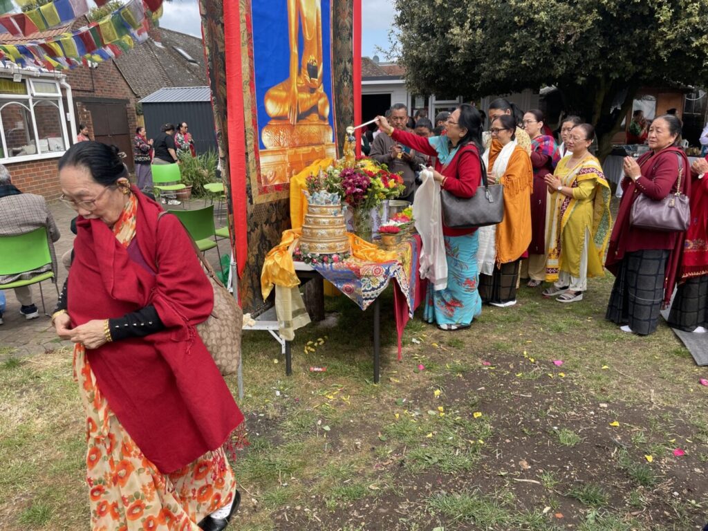 The event was divided in three parts, and the early morning main Gumba priest Dhorje Lopen Shankar Guru performed Sang Puja, in second part H.E. Lhatse Tulku Rinpoche was WELCOME by all devotees and venerable Tulu, BGRUK chairman and representatives from local heads formally open the event with lightning butter lamp. H. E. Lhatse Tulku Rinpoche erect the Big Thanka outside to celebrate and mark the 2569thanniversary, which was donated to BGRUK by himself, and further he has donated £1,000 cash too. He has chanted the prayer while having Ku Thui Puja (showering the Buddha statue) by each individual and encircled the monastery three times along with all devotees.